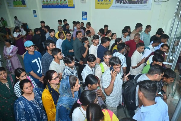 एक कोचिंग संस्थान में प्रवेश के लिए लगी भीड़।