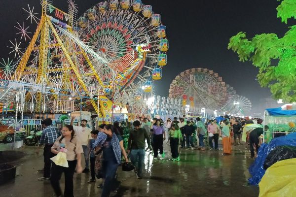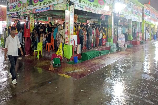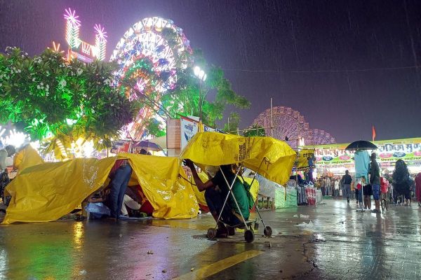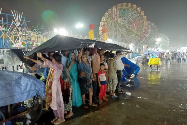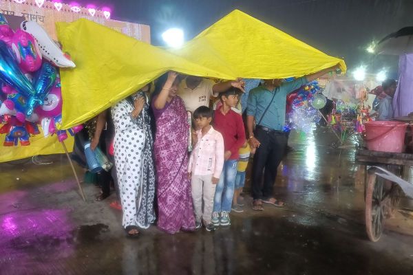 दशहरा मेले में रिविवार को करीब नौ बजे करीब आधे घंटे हुई तेज बारिश के चलते मेले में घूमने आए लोगों को बचने की जहां ठौर मिली वही आसरा लिया।