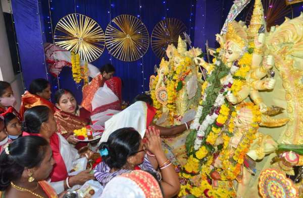 माँ दुर्गा की पूजा अर्चना करती बंगाली समाज की महिलाएं