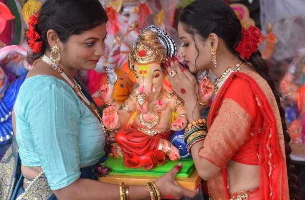 गणेश पूजन के लिए प्रतिमा लेकर जाती बच्ची व महिलाएं।
