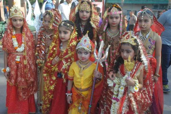 किशोर सागर तालाब की पाल पर हमराह के दौरान दुर्गा स्वरूप कन्याओं की झांकी प्रस्तुत की गई।