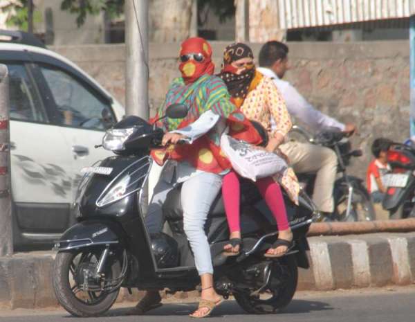 स्कूटी पर सवार महिलाये तपती दोपहर में धूप से बचने का जतन करते हुए |