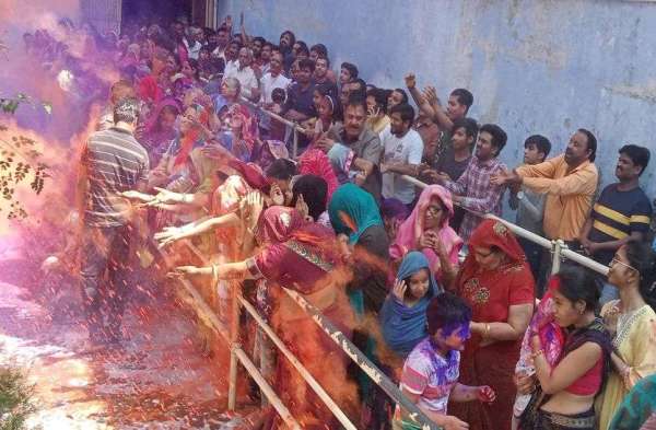 मथुराधीश मंदिर में होली के मनोरथ के लिए लगी कतारें।