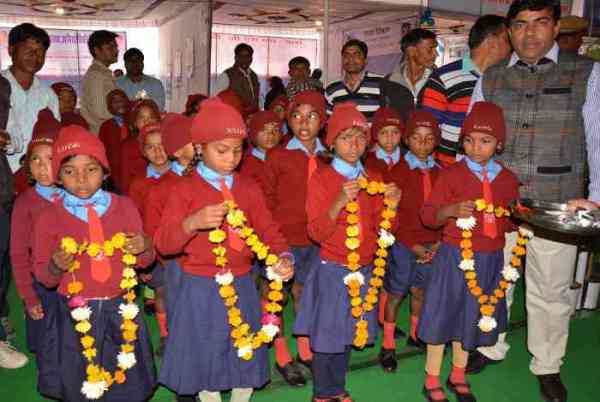 केन्द्रीय सड़क परिवहन एवं जल मंत्री नितिन गडकरी के स्वागत में खडे बच्चे।