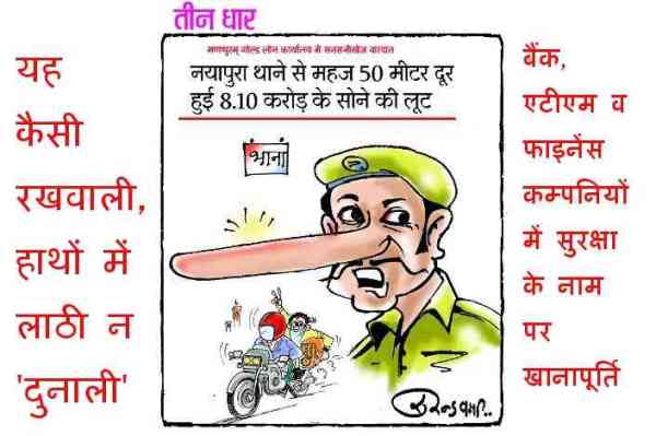 नयापुरा थाने से महज 50 मीटर की दूरी पर स्थित मणप्पुरम फाइनेंस लि. की शाखा में चार लुटेरे बंदूक तानकर लगभग 8.10 करोड़ की लागत का 27 किलो सोना लूट ले गए। लेकिन पुलिस कुछ न कर सकी।