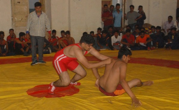 62वीं राज्य स्तरीय विद्यालयी कुश्ती प्रतियोगिता में दमखम दिखाते पहलवान।