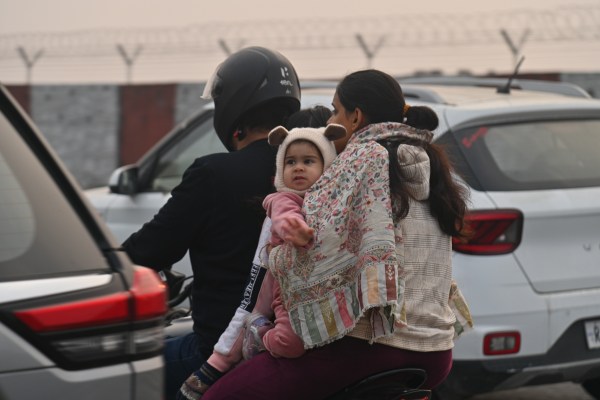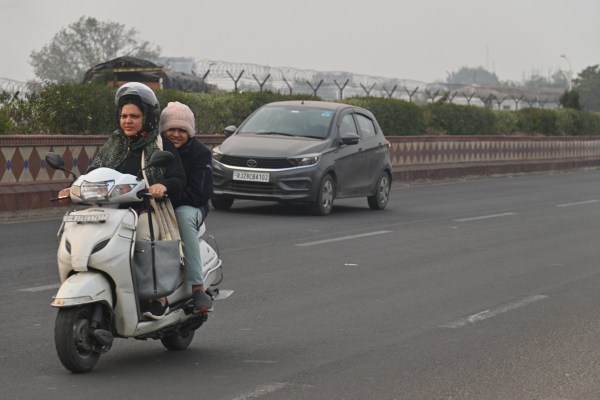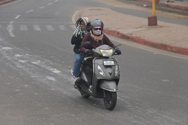 कोटा में कड़ाके की सर्दी में पहन-ओढ़कर गुजरते वाहन चालक।