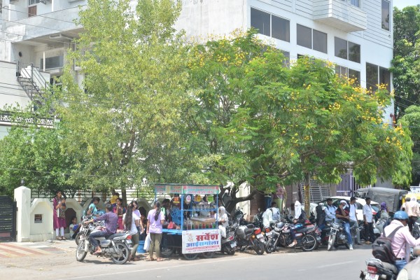 कोटा में भीषण गर्मी से बचने के लिए पेड़ की छांव का सहारा लेते लोग।