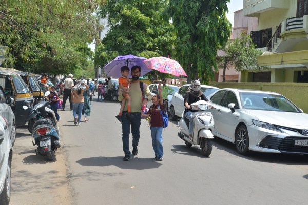 गर्मी से बचने के लिए बच्चों को छाते में लाता पिता।