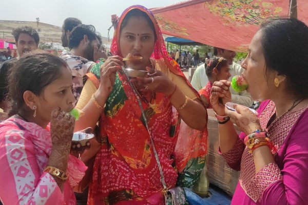 गर्मी में गला तर करने के लिए बर्फ गोला खाती महिलाएं।