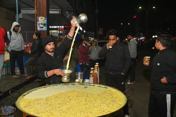 कोटा में तेज सर्दी के दौरान शाम को गर्म दूध का मजा लेते लोग।