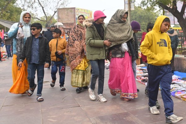 कोटा में तेज सर्दी के दौरान पहन-ओढ़कर मंदिर दर्शन करने जाते श्रद्धालु।