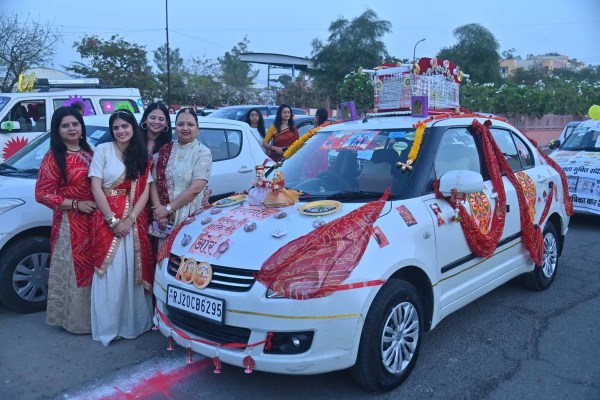 वुमन कार रैली में गणगौर थीम पर सजी कार।