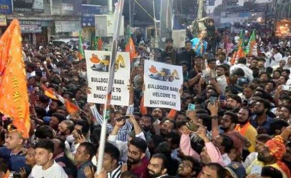 विधायक टी. राजा के समर्थन में पहुंचे योगी आदित्यनाथ का मोबाइल के कैमरों की जलती लाइट के बीच अभूतपूर्व स्वागत किया गया। यह नजारा ऐसा था, जिसे देख हर जुबां बोल उठी- भारत मां के लाल का स्वागत है भाई! स्वागत है। गोरक्षपीठाधीश्वर व उत्तर प्रदेश के मुख्यमंत्री योगी आदित्यनाथ ने घोषामहाल से भाजपा उम्मीदवार टी. राजा सिंह के पक्ष में जनसमर्थन की अपील की। स्वागत से अभिभूत योगी आदित्यनाथ बोले-आपका जज्बा ही हैदराबाद को भाग्यनगर बनाएगा।