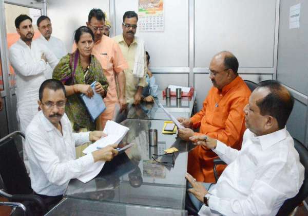 भाजपा पार्टी कार्यालय पर जनता दरबार में जनता की समस्याएं सुनते कैबिनेट मंत्री राजेंद्र प्रताप सिंह ( मोती सिंह ) व बीजेपी प्रदेश मंत्री कामेश्वर सिंह