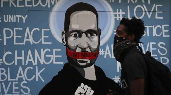 लॉस एंजेसिल के एक कलाकार ने जॉर्ज फ्लॉयड का चित्रण कर उसके मुंह पर कपड़ा बंधा दिखाया है। इस पर लिखा है आई कांट ब्रीथ।