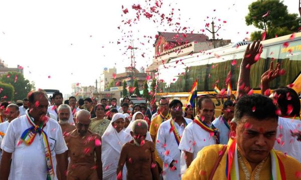 मार्ग में जुलूस का कई जगह पुष्प वर्षा कर स्वागत किया गया । जिस घर के सामने से आचार्य गुजरे घर वालों ने उनका दूध से पाद पक्षालन कर आरती की। बीस पंथी दिगम्बर जैन मंदिर में सकल दिगम्बर जैन समाज ने भव्य स्वागत किया।
