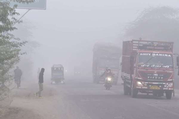 नागौर. बीकानेर रोड़ हाइवे पर सुबह कोहरे के बीच से गुजरते वाहन।