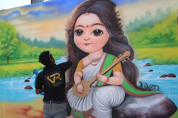 अटल पथ पर माता सरस्वती की खूबसूरत पेंटिंग बनाता हुआ कलाकार ।