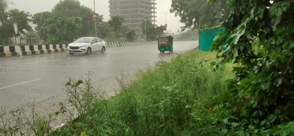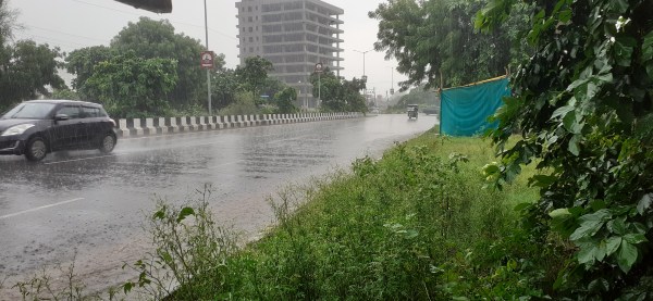 जयपुर के प्रतापनगर िस्थत राणा सांगा मार्ग पर बारिश से गुजरते हुए वाहन।