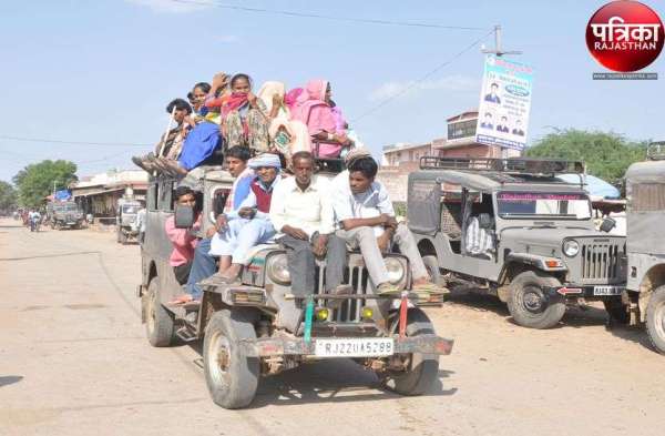 जीपों की छतों पर बैठकर कुछ यूं सफर करते आदिवासी।