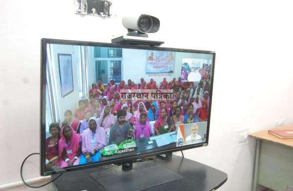 प्रधानमंत्री मंत्री नरेन्द्र मोदी ने गुरुवार को देश के नौ राज्य के १४ स्थानों के स्वयं सहायता समूहों की महिलाओं से विडियो कांफ्रेस से सीधा संवाद किया। पीएम मोदी ने पाली जिले की स्वयं सहायता समूहों की महिलाओं से शहर की चुड़ी उद्योग व बाली तहसील के आदिवासी क्षेत्र में चल रहे सीताफल व्यवसाय पर विस्तार से चर्चा की। इस दौरान केन्द्रीय राज्य मंत्री पी.पी. चौधरी, जिला कलक्टर सुधीरकुमार शर्मा, मुख्य कार्यकारी अधिकारी उदयभानु चारण, एडीएम भागीरथ विश्नोई, सांसद प्रतिनिधि राकेश भाटी व सभापति महेन्द्र बोहरा उपस्थित थे। फोटो: सुरेश हेमनानी