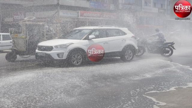शहर के सूरजपोल चौराहे पर पानी के छिड़काव के बाद सड़क पर गुजरते वाहन चालक व राहगीर।