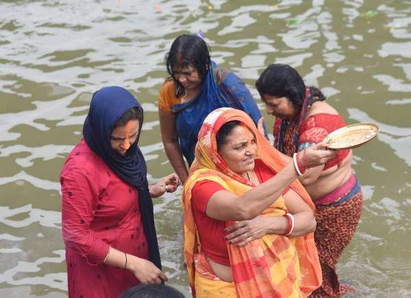पटना में रविवार को अक्षय तृतीया के अवसर पर गंगा नदी में पवित्र डुबकी लगाने के बाद पूजा-अर्चना करते श्रद्धालु।