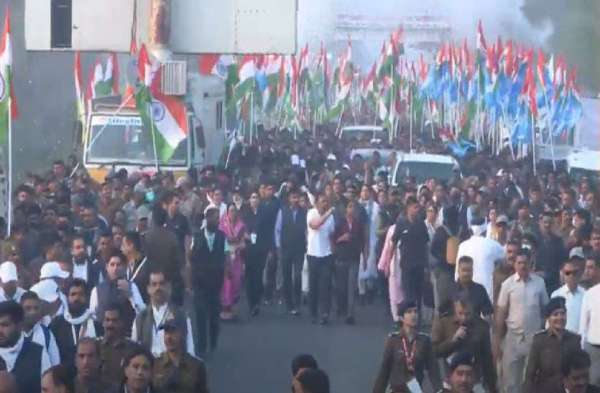 हाथों में तिरंगा लेकर निकली भारत जोड़ो यात्रा।