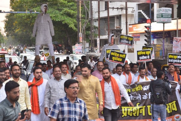 National Herald: नारेबाजी करते हुए हाथों में सोनिया गांधी और राहुल गांधी का पुतला लेकर भाजपा युवा मोर्चा के नेता चल रहे थे। जब प्रदर्शनकारियों ने देखा कि पुलिस आगे बढ़ने नहीं दे रही तो अचानक पुतला जला दिया गया। जलते पुतले को जमीन पर गिराकर उसे लातें भी भाजपा नेताओं ने मारी।