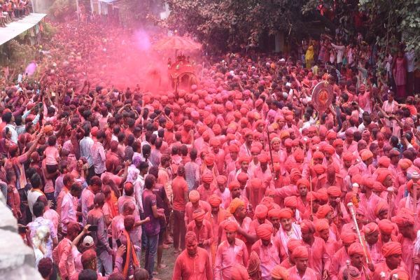 भगवान की श्रृंगारित प्रतिमा केवड़े के फूल में बिराजित थी। सोने की पालकी जैसे-जैसे आगे बढ़ती गई मकानों की छतों व झरोखों में खड़े श्रद्धालुओं ने बेवाण पर जमकर पुष्प वर्षा की। बेवाण के आगे भक्तजन जयकारे लगाते और भजनों की धुनों पर नाचते चल रहे थे। हर कोई गुलाल में रंगा नजर आ रहा था।