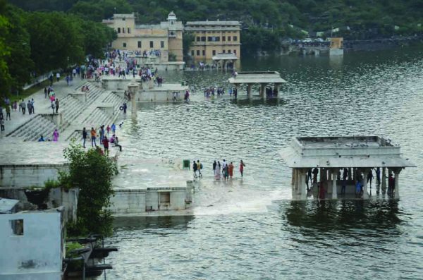 राजसमंद झील के लबालब भरने पर लवाणा में लोगों के मवेशियों के बांधने के लिए बने बाड़ों में भरा पानी।