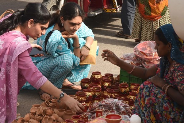 जोधपुर में करवा चौथ व्रत के लिए नयापुरा स्थित दुकान से पूजा की थाली एवं करवा ख़रीदती महिलाएं। फ़ोटो- गौतम उडेलिया
