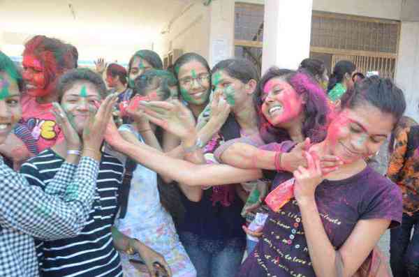 कॉलेज में लड़कियों की टोलियां एक-दूसरे को घंटों गुलाल लगाती रहीं। जिस भी साथी को गुलाल नहीं लगा था, उसे पकड़कर खूब गुलाल लगाया। फेसबुक पर देखें लाइव वीडियो