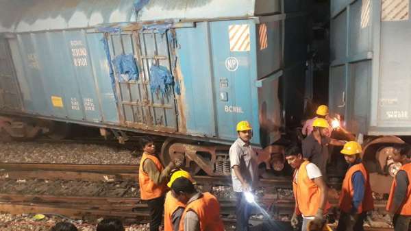 पटरी से उतरी बाेगी (वैगन) काे धकेलने की काेशिश करते एक्सीडेंट रिलीफ टीम