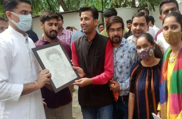 चित्रकार महेश गूर्जर के नेतृत्व में कला शिक्षक अभ्यर्थियों दल ने सचिन पायलट को उनका पोट्रेट भेट किया है।