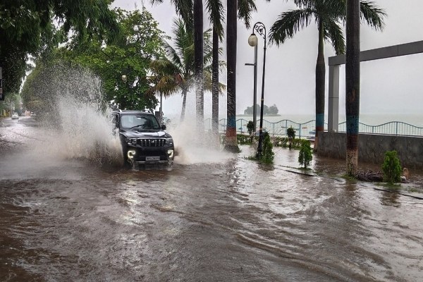 भोपाल में बड़े तालाब का जल स्तर बढ़ा। सड़क और तालाब का पानी ऐसा लग रहा जैसे तालाब का पानी बाहर आ गया हो। फोटो सुभाष ठाकुर