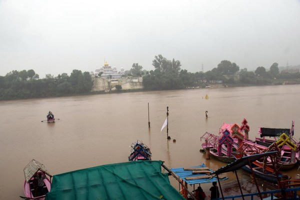 जबलपुर में लगातार बारिश से नर्मदा का जल स्तर बढ़ा । गौरी घाट का दृश्य ।फोटो अफरोज खान