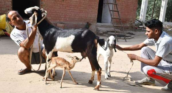 बीकानेर में वन्यजीव सप्ताह के दौरन एक हिरण के बच्चे की जान बचाने के लिए एक बकरी अपना स्तनपान करवा रही है।मां -बाप किस रूप में और कहां मिल जाए कुछ कहा नहीं जा सकता। राजस्थान जीव प्रेमियों की धरती के नाम से विख्यात है वन विभाग के रेस्क्यू सेंटर में कोई शख्स हिरण के बच्चे को सुपुर्द करके गया था। ऐसे में बच्चे के जीवन को बचाने के लिए अब उस बच्चे को बकरी का दूध पिलाकर बड़ा किया जा रहा है। रेस्क्यू सेंटर में तैनात सुरक्षा कर्मी सीताराम ने बताया पहले हिरण के बच्चो को बहार से लेकर दूध की व्यवस्था की जाती थी लेकिन उस दूध से बच्चे ज्यादा सरवाइव नहीं कर पाते थे। ऐसे में जब यह हिरण का बच्चा आया तो इसे दूध पिलाने के लिए एक बकरी की व्यवस्था की गई है। बच्चा बकरी का दूध पी रहा है। और काफी स्वस्थ भी है। फोटो नौशाद अली