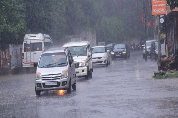 उदयपुर में करीब एक घंटा हुई बारिश के दौरान गुलाब बाग मार्ग पर पानी भर गया। बारिश के दौरान गुजरते वाहन। फोटो— प्रमोद सोनी