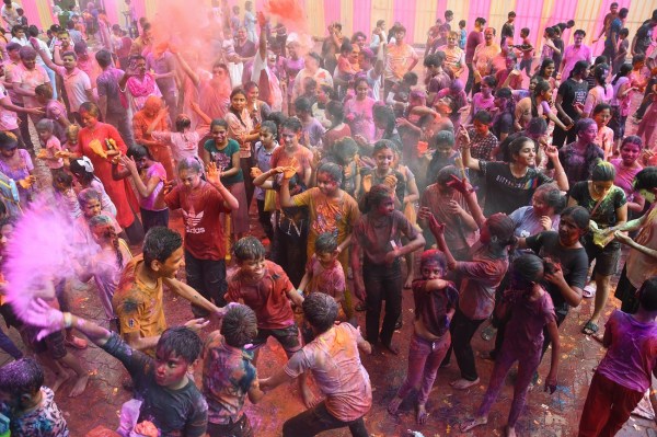 चेन्नई के साहुकारपेट स्थित मिंट स्ट्रीट में होली के मौके पर एक दूसरे को रंग गुलाल लगाते युवा।