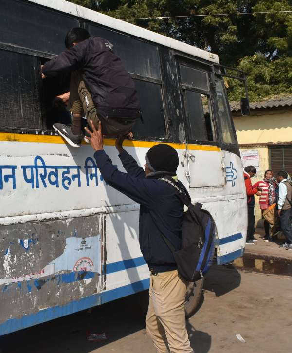 अलवर बस में खिड़की से चढ़ाता युवक।