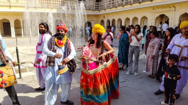 हवा महल परिसर में कच्ची घोड़ी का डांस करती महिला पर्यटक। फोटो अनुग्रह सोलोमन।