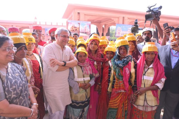 रेल मंत्री अश्वनी वैष्णव मौके पर मौजूद मजदूर महिलाओं के साथ फोटो खिंचवाते। फोटो अनुग्रह सोलोमन।