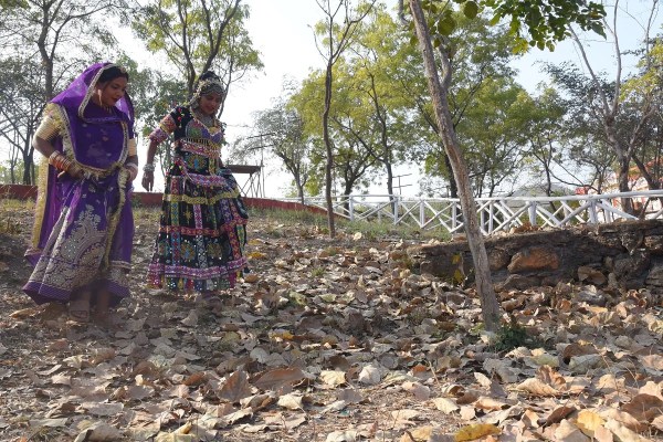 बढ़ते कदमों में सूखे पत्तों की खरखराहट…उदयपुर में दो सखियां पेड़ों के नीचे बिछे सूखे पत्तों में कदम रखती है तो खरखराहट गूंज उठती है। शिल्पग्राम में लोक कलाकार सखियां मौसमी बदलाव की झलक दिखा रही है।फोटो: प्रमोद सोनी