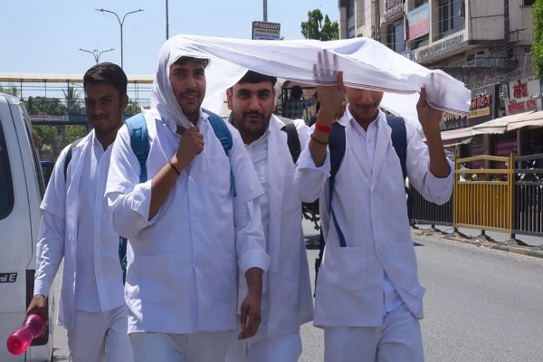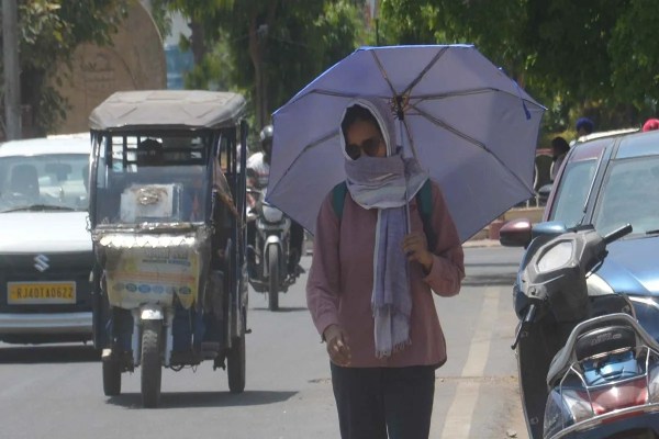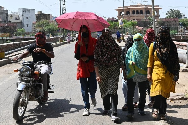 अलवर में दोपहर में धूप से बचाव के लिए स्कार्फ़ और छतरी का सहारा लेकर जाते हुए। फोटो अंशुम आहूजा