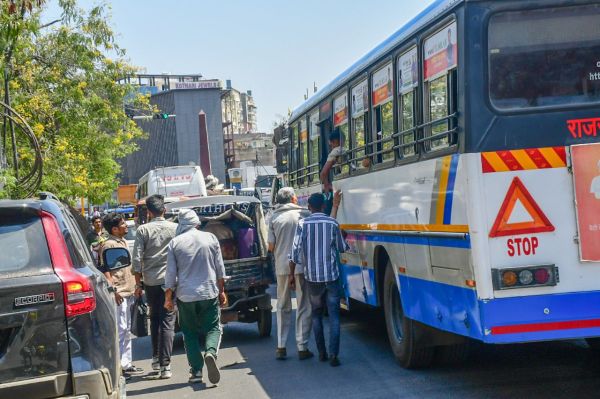 नारायणसिंह सर्किल पर बसे नहीं रुकी। त्रिमूर्ति सर्किल की तरफ रेड लाइट पर बसों ने रोक कर लोगों को बिठाया। फोटो अनुग्रह सोलोमन।