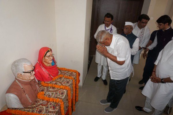 लाइब्रेरी के उद्घाटन के दौरान वहां लगी मूर्ति को नमन करते जगदीप धनकड़। फोटो अनुग्रह सोलोमन।