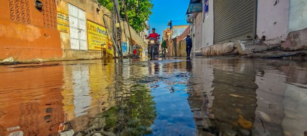 गोविंद नगर रोड पर पेयजल लाइन के टूटने से बहे पानी से पूरी रोड पर पानी भर गया। फोटो अनुग्रह सोलोमन।