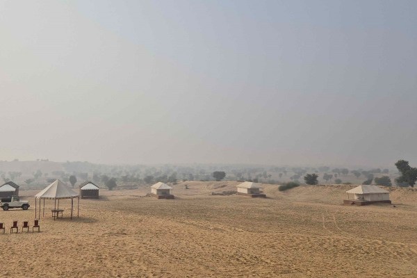 कोहरे की चादर में लिपटे सोनलिये धोरे…बीकानेर से करीब 15 किमी दूर रायसर गांव में स्थित बालू मिट्टी के सोनलिये धोरे कोहरे व धुंध की चादर में लिपटे नजर आ रहे है। दोपहर में भी कोहरे के कारण धोरे धुंधले से नजर आते रहे। फोटो नौशाद अली।